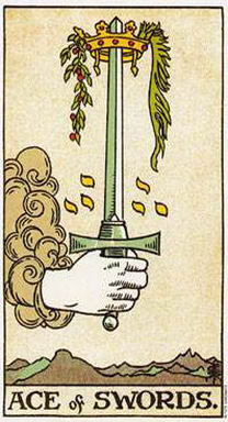 寶劍王牌描繪的是一隻從雲(或是精神)中伸出的手,掌中握著一把劍,劍端由一頂黃金皇冠的中間穿過。背景是一系列的淡灰色,而劍本身則是鮮明的藍色。劍代表的是通澈的思想,亞瑟*維特(Arthur Waite,本書所使用的塔羅牌的設計者)也就是利用“藍”這個顏色來強調它。這把劍是朝上的,而且雙刃都看得到,表示說狀況的兩面都清楚的呈現在眼前。它表示注意到了生命的二元性。皇冠代表的是物質世界,而劍刺穿了這個世界,由精神層面來看,它暗示您的心智可以看透物質世界,而看到事件的精神面因素,以及思想在物質世界中所造成的結果。這是一種理解,理解到宇宙中既沒有獎賞,也沒有懲罰,只有結果。這張王牌告訴我們的是,計畫或開始一項新的冒險行為。生命提供你一項新的可能,而你必須謹慎的評估任何所採取的行動可能帶來的後果。