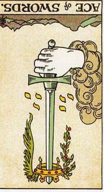 逆位的寶劍王牌暗示思考、想法和計畫上的困惑。或許你沒有辦法看清楚在這個關鍵點上應做的選擇。在下決定之前,先讓自己集中注意力是比較明智的。你的想法可能脫離了現實和環境,而非務實和有用的。這張牌可能意指你的想法或計畫是行不通的,或是由於你缺乏明確的思考,而且如果你沒有明確目標的話,獲得成功的機會將是十分渺茫的。你應該多花時間來想清楚,檢視每一種選擇,並將那些不切實際或難以實現者排除。此時此刻任何草率的行動似乎都很難有什麼成就。你可能正焦急的要開始進行新事物,但是卻不知道該從那個正確的方向著手。放輕鬆,並且讓你的腦袋沉湎下來,在開始任何新事物之前,先形成一個有凝聚力的計畫。