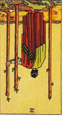 逆位元的權杖三表示需要沉思的一段時間。權杖三逆位也可能代表延遲。逆位的權杖三也指出你身體或情緒上的成長受到阻礙的一段時間,暗示著你可能需要採取新方法。它也可以表示你被過去的行為與決定所攪亂。