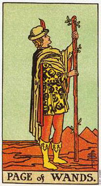 權杖侍者你可以把他想像成爆竹的火焰,他參與任何事之前不會加以思索。他像是雙子座,有點古怪,非常善變,好玩耍,有創意,戲劇性,溫暖,然而不穩定。當你看到這張牌,把他想像成一個小孩。你無法打敗他,但是他自己卻無法堅持到最後。權杖侍者象徵一項新方案或挑戰的消息或開始。塔羅牌的侍者可形容孩子或任何二十二歲以下的人。權杖侍者意指該是開始某些新事物的時候了。它是展開一項新方案或旅行的行動,且將指引你一個新方向。當牌局中出現了權杖侍者,而你有已超過二十二歲,這狀況是你再度感覺年輕。