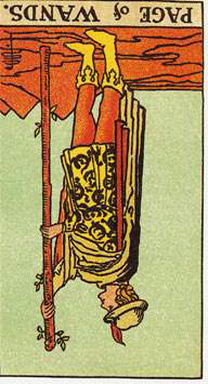 權杖侍者逆位意指思考太多而行動不足或優柔寡斷。正立的侍者意指你很快就能使計畫成形,而逆位的侍者則暗示你花太多時間計畫,相對地,實現計畫的時間就少了。所以在行動之前猶豫不決是這張牌的另一個意思。它可形容沒有能力開始新事物,或是可以幫助你展開新方案的消息來源延遲了。這個人缺少某些正立侍者牌所代表的狂熱和激情,而這可能是環境或教養給壓抑下來的。在兩性關係的演算法中,逆位侍者牌可以表示一個不可預測的年輕人,他的烈性子或稍不留神,都可能在一段兩性關係達到巔峰前就停滯不前了。這張逆位侍者牌所形容的兩性關係是,由於不受拘束的狂熱和激情,或伴侶之一需要經常性的挑戰,而是這段關係提早結束。