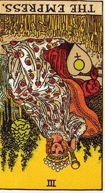 皇后逆位意味家庭環境或某段兩性關係中遭遇到的困難。可能你無法實現你的計畫或在某段關係中,你沒有辦法打開心胸去愛,因為你對愛情過於知性或理想化了。它可能意味著,你是有了談戀愛的念頭,但卻發現自己無法為兩性關係付出努力。在關於孩子的問題上,皇后逆位可能意味流產、墮胎或生產。皇后牌逆位的另一層意思可說是,冷靜地思考所有的選擇之後,運用理性來解決問題。皇后逆位,女性的特質受到阻礙,當事人可能不再自由表達情感,否定自己的情緒與慾望,或者不願付出關愛,成為一個失職的母親。另一方面,也有可能感性特質發展過度,變得完全沒有理智,只憑感覺做事。在最好的情況下,皇后逆位可以得到正位所欠缺的特質,表示當事人能夠以理性思考的冷靜態度來解決問題,特別是情感問題。