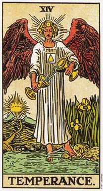 在女祭司牌上,被布幔遮掩住的那池水,在節制牌中已清晰可見。一名天使一腳站在水中,另一腳站在陸地,雙手各握一個杯,把水在兩個杯子之間倒來倒去。有一條道路通往遠方日落之處。天使的頭部有一個明顯的光環或能量區域。在塔心臟的氣輪或能量中心,有一個白色的四方形,中間一個橘色的三角形。融合自己的精神和動物層面,是節制牌所意味的。四方形(土)中的橘色三角形(火),代表精神自有形的身體中升起。
