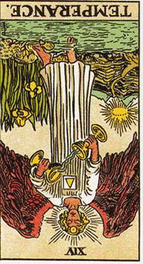 當節制牌逆位時,它可能暗示學習而非教學。而旅行也是有可能的。這張牌逆位可能是在暗示,你不願意傾聽你那具有神性的自我,或是你並不向去哺育或滋養它。當你過度耽溺於你人的欲望時,這種情況就會發生。節制牌逆位元代表沒有目的的行為,這包括沒有目的的流行。或許在你著手進行任何行動之前,你應該重新認識你的目的。這張牌也意味對於在某種狀況內該怎麼辦缺乏瞭解,或是從一個極端走向另外一個極端。它可以形容一個人為了得到滿足感而不斷尋找目標,而結果卻只有失望,以及繼續地設定下一個目標。