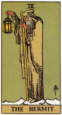 隱者牌暗示一段反省的時間。它代表著一段想要讓你的過去、現在,以及未來成為有意義的時間。這張牌代表去看諮商輔導員、持續一段夢想之旅,或為了開發你自己的沉思。它也代表成熟,以及你已經知道生命中真正重要的是什麼。它可能意味著得到身體或心靈上的協助及智因;或是你幫助其他人發現人生理解及事件的導因。它也代表一段時間內,你會問自己如下的問題:我從何處來?我現在位於何處?又將往何處去?