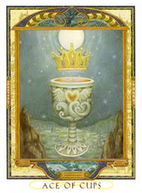 在兩性關係的演算法中,聖杯王牌確實是一張相當積極的牌。它可能是在暗示你兩性關係當眾的某個人正在幫助你和你的心靈目標連接。這段關係正提醒你心靈的泉源,並以愛將你和那泉源連結起來。王牌也可能意指一段新關係,或一段既存關係中的新階段。