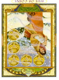 錢幣五暗示你和伴侶的分離,而且無論你們是分開,或者仍在一起,你都是孤獨而寂寞的。這種關係現實的是心靈空虛的症狀,你的饑渴已經到了一種沒有任何肉體或情感關係能夠喂飽你的程度了。這張牌暗示或許是到了你重新認識自己真正的人生目標的適當時候了。為了平息你的饑渴,內在的改變是需要的