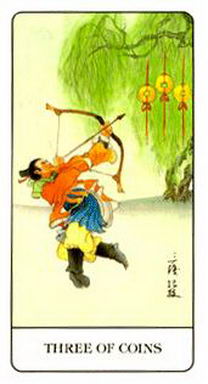 錢幣三可以表示你在建立及維持一段兩性關係的努力。你可能正在閱讀有關兩性關係的書,學習兩性關係的互動,更努力與經營現有的夥伴關係,或正在治療導源於先前兩性關係而殘留的問題。它意味著你正在建立某種持久的兩性關係,或透過努力來改善某個兩性關係。