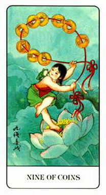 錢幣九代表一種舒適而成功的兩性關係,物質上的成功讓你有餘裕去追求個人的興趣及目標。財務獨立和物質的目標應該是這段關係的重點。只要你一直保持穩固,許多事物都可以因刃而解。牌中所畫的小鳥帶著頭罩,因此它失去許多自由。這女人同樣失去她的某些自由,然而她知道這便是獲得成功的代價。自律所要求的選擇,有時候會強迫你放棄某些事物,諸如自發性。